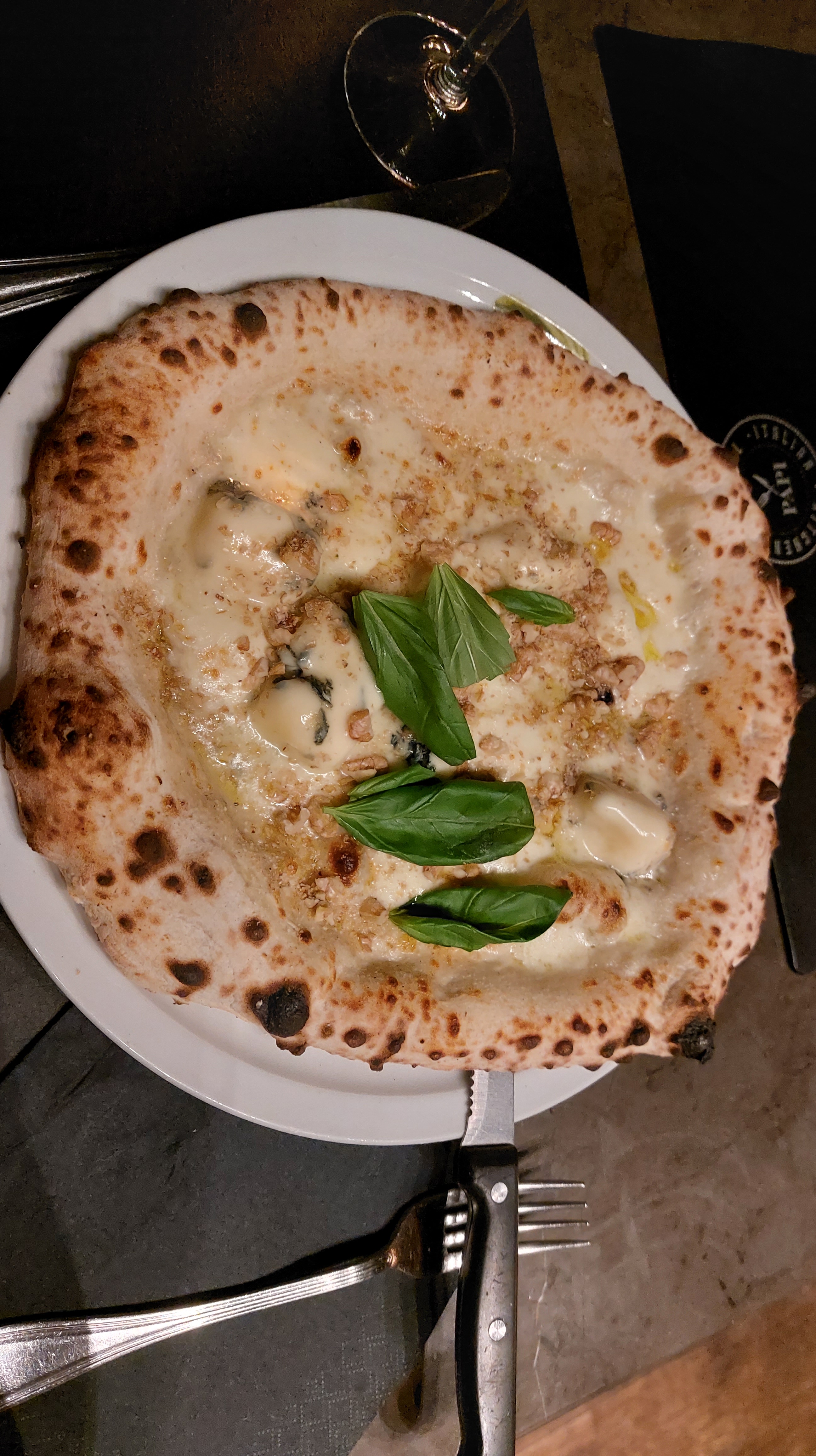 I ordered the Quattro Formaggi—with more wine, of course. (As if I hadn’t already had enough.) Plot twist: I forgot to ask for the pizza without nuts. Oops. I figured I’d just scrape them off later and call it a day.