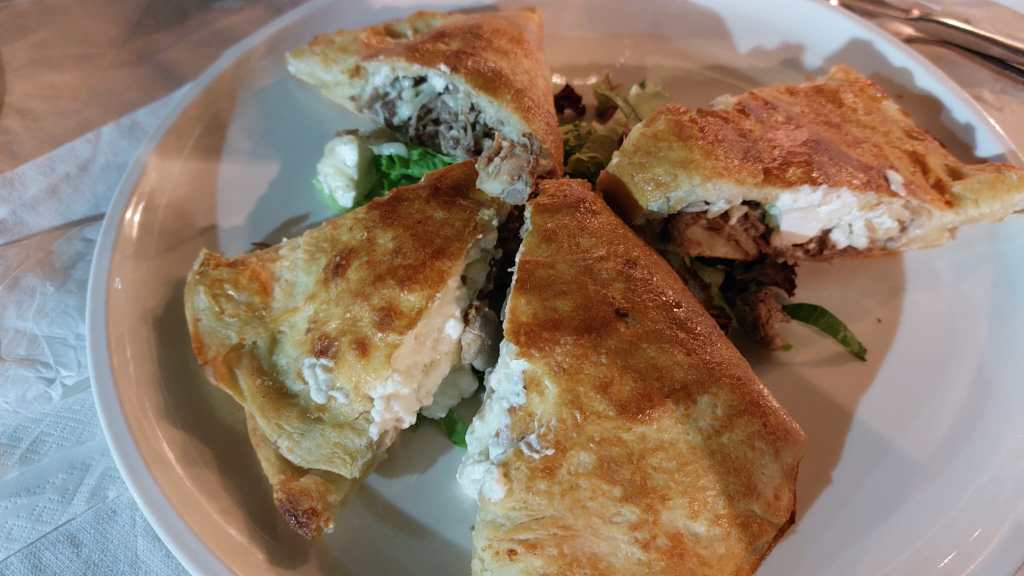 And for the main dish, a meat-filled pita — Spanakopita. It was delicious, fresh, seasoned, and very enjoyable. YUMMY. I ate like a queen and felt like one too.